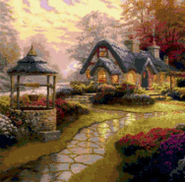 Ориентировочно так, схема вышивки «Variant 3», созданная автором Lamisa, будет выглядеть при отшиве на канве. Размер данной вышивки равен 188x185 крестов, при этом используется 63 цветов. Ключевые слова, по которым можно найти эту схему: пейзаж, домик, вечер. Также, вы можете взглянуть на оригинальную картинку, соответствующую данной схеме вышивки.