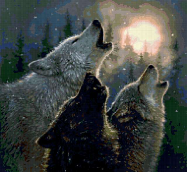 Ориентировочно так, схема вышивки «Variant 3», созданная автором Lamisa, будет выглядеть при отшиве на канве. Размер данной вышивки равен 190x175 крестов, при этом используется 48 цветов. Ключевые слова, по которым можно найти эту схему: животные, волки, ночь, зима. Также, вы можете взглянуть на оригинальную картинку, соответствующую данной схеме вышивки.
