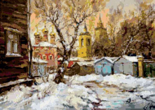 Ориентировочно так, схема вышивки «Variant 3», созданная автором Lamisa, будет выглядеть при отшиве на канве. Размер данной вышивки равен 190x135 крестов, при этом используется 48 цветов. Ключевые слова, по которым можно найти эту схему: город, храмы. Также, вы можете взглянуть на оригинальную картинку, соответствующую данной схеме вышивки.