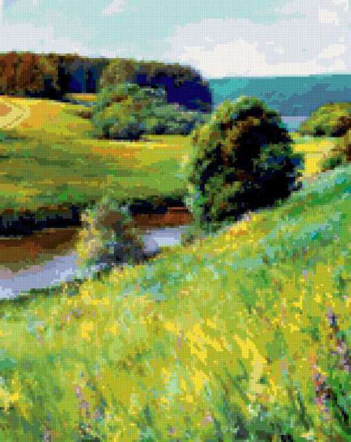 Ориентировочно так, схема вышивки «Variant 3», созданная автором Lamisa, будет выглядеть при отшиве на канве. Размер данной вышивки равен 151x190 крестов, при этом используется 70 цветов. Ключевые слова, по которым можно найти эту схему: природа, пейзаж, лето. Также, вы можете взглянуть на оригинальную картинку, соответствующую данной схеме вышивки.