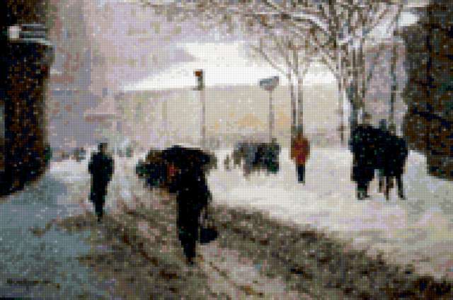 Ориентировочно так, схема вышивки «Variant 3», созданная автором Lamisa, будет выглядеть при отшиве на канве. Размер данной вышивки равен 190x126 крестов, при этом используется 57 цветов. Ключевые слова, по которым можно найти эту схему: город, пейзаж, зима, люди. Также, вы можете взглянуть на оригинальную картинку, соответствующую данной схеме вышивки.