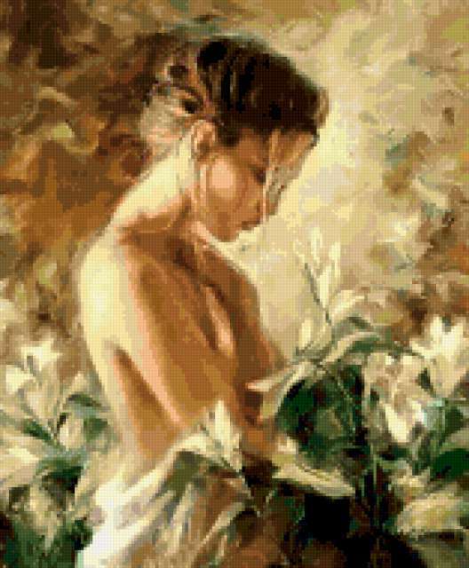Ориентировочно так, схема вышивки «Variant 3», созданная автором Lamisa, будет выглядеть при отшиве на канве. Размер данной вышивки равен 157x190 крестов, при этом используется 67 цветов. Ключевые слова, по которым можно найти эту схему: цветы, cvety, девушка. Также, вы можете взглянуть на оригинальную картинку, соответствующую данной схеме вышивки.