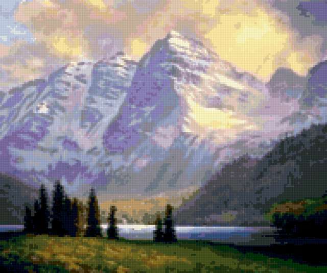 Ориентировочно так, схема вышивки «Variant 3», созданная автором Lamisa, будет выглядеть при отшиве на канве. Размер данной вышивки равен 190x159 крестов, при этом используется 72 цветов. Ключевые слова, по которым можно найти эту схему: природа, priroda, горы. Также, вы можете взглянуть на оригинальную картинку, соответствующую данной схеме вышивки.