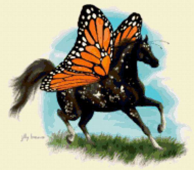 Ориентировочно так, схема вышивки «Variant 3», созданная автором Lamisa, будет выглядеть при отшиве на канве. Размер данной вышивки равен 190x166 крестов, при этом используется 62 цветов. Ключевые слова, по которым можно найти эту схему: животные, zhivotnye, лошади, фэнтези. Также, вы можете взглянуть на оригинальную картинку, соответствующую данной схеме вышивки.