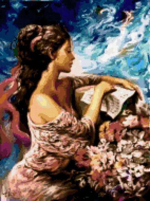 Ориентировочно так, схема вышивки «Variant 3», созданная автором Lamisa, будет выглядеть при отшиве на канве. Размер данной вышивки равен 142x190 крестов, при этом используется 85 цветов. Ключевые слова, по которым можно найти эту схему: девушка, цветы, cvety. Также, вы можете взглянуть на оригинальную картинку, соответствующую данной схеме вышивки.