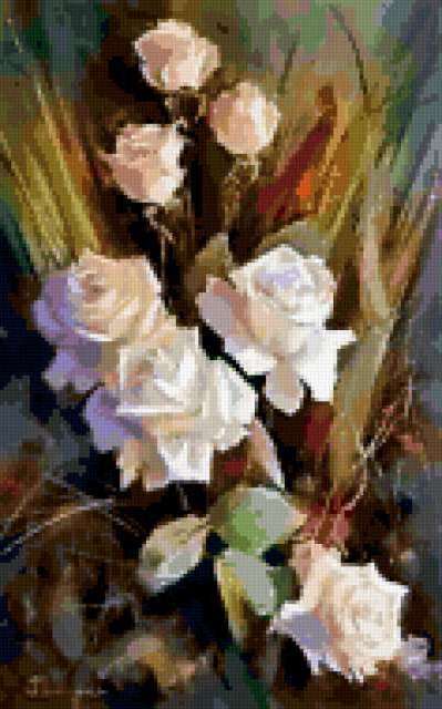 Ориентировочно так, схема вышивки «Variant 3», созданная автором Lamisa, будет выглядеть при отшиве на канве. Размер данной вышивки равен 118x189 крестов, при этом используется 80 цветов. Ключевые слова, по которым можно найти эту схему: цветы, розы, rozy. Также, вы можете взглянуть на оригинальную картинку, соответствующую данной схеме вышивки.