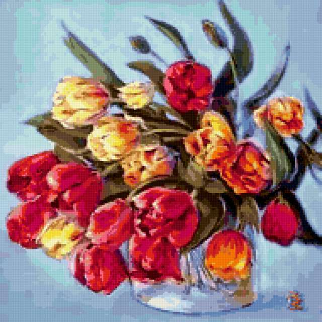 Ориентировочно так, схема вышивки «Variant 3», созданная автором Lamisa, будет выглядеть при отшиве на канве. Размер данной вышивки равен 190x190 крестов, при этом используется 71 цветов. Ключевые слова, по которым можно найти эту схему: цветы, cvety, букеты. Также, вы можете взглянуть на оригинальную картинку, соответствующую данной схеме вышивки.