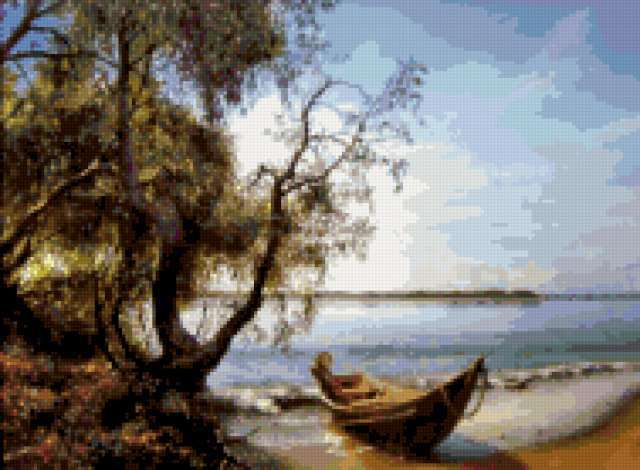 Ориентировочно так, схема вышивки «Variant 3», созданная автором Lamisa, будет выглядеть при отшиве на канве. Размер данной вышивки равен 189x139 крестов, при этом используется 77 цветов. Ключевые слова, по которым можно найти эту схему: пейзаж, море, лодка. Также, вы можете взглянуть на оригинальную картинку, соответствующую данной схеме вышивки.