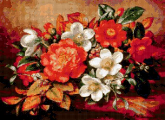 Ориентировочно так, схема вышивки «Variant 4», созданная автором Lamisa, будет выглядеть при отшиве на канве. Размер данной вышивки равен 190x139 крестов, при этом используется 49 цветов. Ключевые слова, по которым можно найти эту схему: цветы, букеты. Также, вы можете взглянуть на оригинальную картинку, соответствующую данной схеме вышивки.