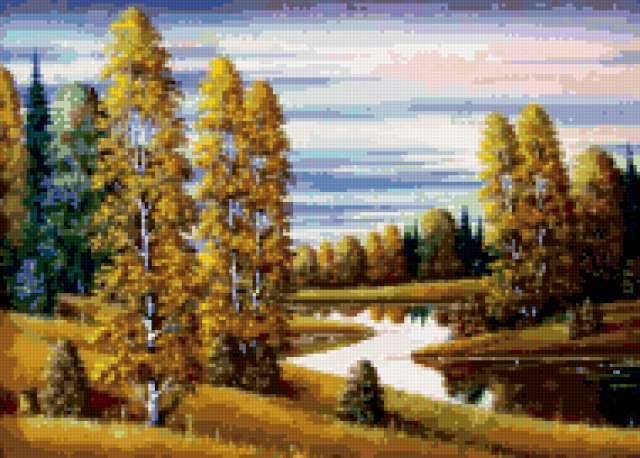 Ориентировочно так, схема вышивки «Variant 4», созданная автором Lamisa, будет выглядеть при отшиве на канве. Размер данной вышивки равен 190x136 крестов, при этом используется 49 цветов. Ключевые слова, по которым можно найти эту схему: природа, река. Также, вы можете взглянуть на оригинальную картинку, соответствующую данной схеме вышивки.