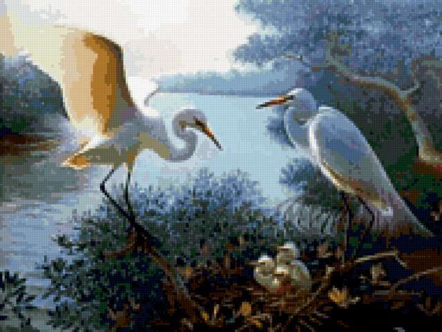 Ориентировочно так, схема вышивки «Variant 4», созданная автором Lamisa, будет выглядеть при отшиве на канве. Размер данной вышивки равен 190x143 крестов, при этом используется 55 цветов. Ключевые слова, по которым можно найти эту схему: природа, птицы, pticy, пара. Также, вы можете взглянуть на оригинальную картинку, соответствующую данной схеме вышивки.