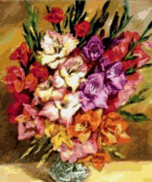 Ориентировочно так, схема вышивки «Variant 4», созданная автором Lamisa, будет выглядеть при отшиве на канве. Размер данной вышивки равен 159x190 крестов, при этом используется 88 цветов. Ключевые слова, по которым можно найти эту схему: cvety, цветы, букеты. Также, вы можете взглянуть на оригинальную картинку, соответствующую данной схеме вышивки.