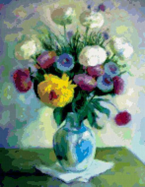 Ориентировочно так, схема вышивки «Variant 4», созданная автором Lamisa, будет выглядеть при отшиве на канве. Размер данной вышивки равен 147x190 крестов, при этом используется 86 цветов. Ключевые слова, по которым можно найти эту схему: цветы, cvety, букеты. Также, вы можете взглянуть на оригинальную картинку, соответствующую данной схеме вышивки.