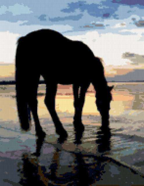 Ориентировочно так, схема вышивки «Variant 4a», созданная автором Lamisa, будет выглядеть при отшиве на канве. Размер данной вышивки равен 147x190 крестов, при этом используется 42 цветов. Ключевые слова, по которым можно найти эту схему: природа, закат, вечер, конь. Также, вы можете взглянуть на оригинальную картинку, соответствующую данной схеме вышивки.