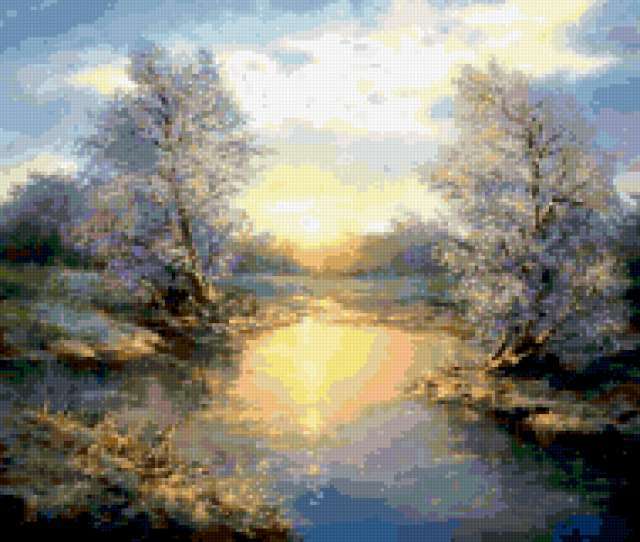 Ориентировочно так, схема вышивки «Variant 5», созданная автором Lamisa, будет выглядеть при отшиве на канве. Размер данной вышивки равен 190x161 крестов, при этом используется 77 цветов. Ключевые слова, по которым можно найти эту схему: природа, пейзаж, зима. Также, вы можете взглянуть на оригинальную картинку, соответствующую данной схеме вышивки.