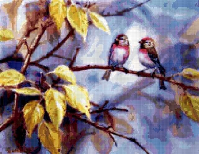 Ориентировочно так, схема вышивки «Variant 5», созданная автором Lamisa, будет выглядеть при отшиве на канве. Размер данной вышивки равен 190x147 крестов, при этом используется 72 цветов. Ключевые слова, по которым можно найти эту схему: природа, птицы, pticy, пара. Также, вы можете взглянуть на оригинальную картинку, соответствующую данной схеме вышивки.