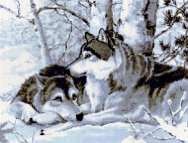 Ориентировочно так, схема вышивки «Variant 5», созданная автором Lamisa, будет выглядеть при отшиве на канве. Размер данной вышивки равен 186x142 крестов, при этом используется 23 цветов. Ключевые слова, по которым можно найти эту схему: животные, zhivotnye, волки, пара. Также, вы можете взглянуть на оригинальную картинку, соответствующую данной схеме вышивки.