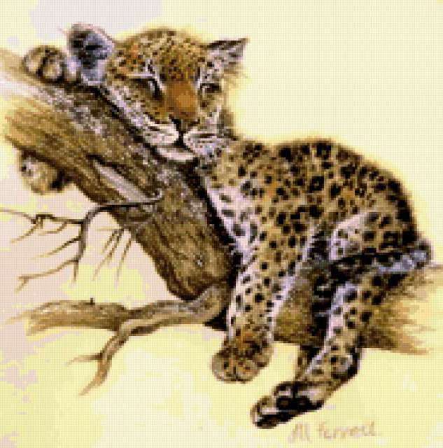 Ориентировочно так, схема вышивки «Variant 5a», созданная автором Lamisa, будет выглядеть при отшиве на канве. Размер данной вышивки равен 186x188 крестов, при этом используется 51 цветов. Ключевые слова, по которым можно найти эту схему: животные, леопард, подушка. Также, вы можете взглянуть на оригинальную картинку, соответствующую данной схеме вышивки.