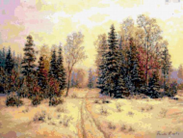 Ориентировочно так, схема вышивки «Variant 6», созданная автором Lamisa, будет выглядеть при отшиве на канве. Размер данной вышивки равен 190x143 крестов, при этом используется 64 цветов. Ключевые слова, по которым можно найти эту схему: природа, лес, зима. Также, вы можете взглянуть на оригинальную картинку, соответствующую данной схеме вышивки.