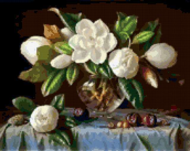 Ориентировочно так, схема вышивки «Variant 6», созданная автором Lamisa, будет выглядеть при отшиве на канве. Размер данной вышивки равен 172x137 крестов, при этом используется 70 цветов. Ключевые слова, по которым можно найти эту схему: цветы, cvety, букеты, натюрморт. Также, вы можете взглянуть на оригинальную картинку, соответствующую данной схеме вышивки.