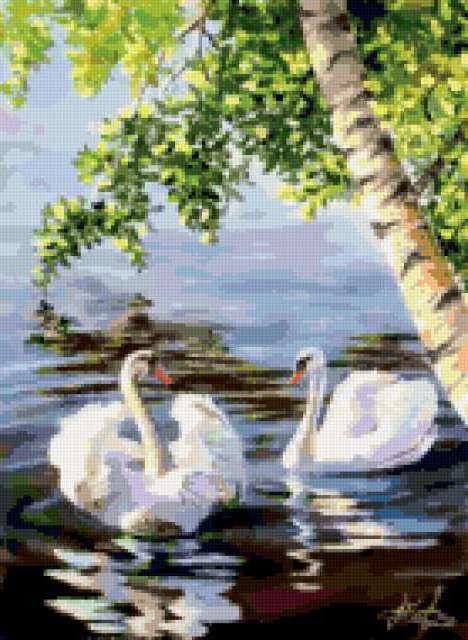Ориентировочно так, схема вышивки «Variant 6», созданная автором Lamisa, будет выглядеть при отшиве на канве. Размер данной вышивки равен 139x190 крестов, при этом используется 68 цветов. Ключевые слова, по которым можно найти эту схему: природа, птицы, лебеди. Также, вы можете взглянуть на оригинальную картинку, соответствующую данной схеме вышивки.