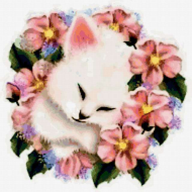Ориентировочно так, схема вышивки «Variant 6», созданная автором Lamisa, будет выглядеть при отшиве на канве. Размер данной вышивки равен 190x190 крестов, при этом используется 84 цветов. Ключевые слова, по которым можно найти эту схему: животные, кошки, подушка. Также, вы можете взглянуть на оригинальную картинку, соответствующую данной схеме вышивки.