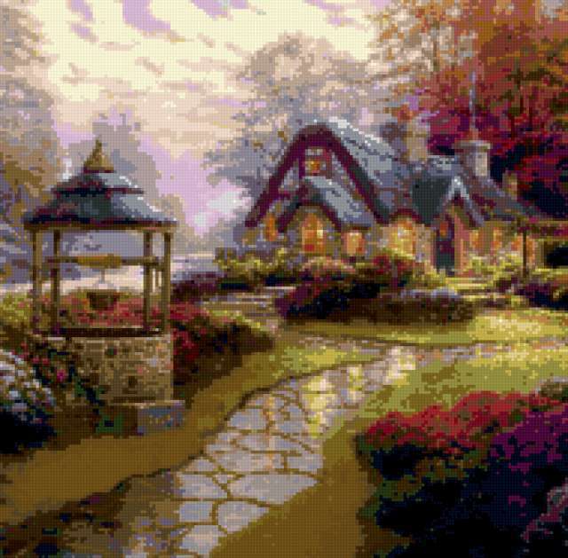 Ориентировочно так, схема вышивки «Variant 7», созданная автором Lamisa, будет выглядеть при отшиве на канве. Размер данной вышивки равен 190x187 крестов, при этом используется 48 цветов. Ключевые слова, по которым можно найти эту схему: пейзаж, домик, вечер. Также, вы можете взглянуть на оригинальную картинку, соответствующую данной схеме вышивки.