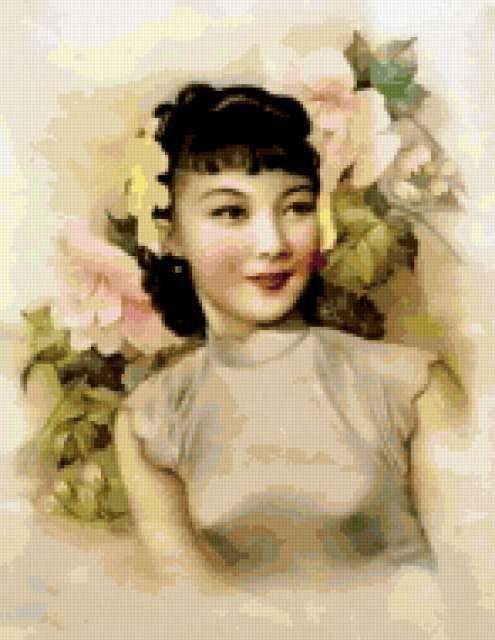 Ориентировочно так, схема вышивки «Variant 8», созданная автором Lamisa, будет выглядеть при отшиве на канве. Размер данной вышивки равен 147x190 крестов, при этом используется 67 цветов. Ключевые слова, по которым можно найти эту схему: девушка, дама, цветы, Восток. Также, вы можете взглянуть на оригинальную картинку, соответствующую данной схеме вышивки.