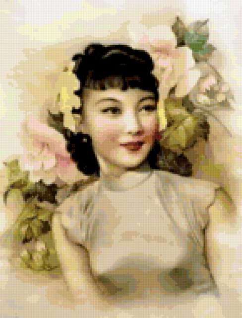 Ориентировочно так, схема вышивки «Variant 9», созданная автором Lamisa, будет выглядеть при отшиве на канве. Размер данной вышивки равен 145x190 крестов, при этом используется 67 цветов. Ключевые слова, по которым можно найти эту схему: девушка, дама, цветы, Восток. Также, вы можете взглянуть на оригинальную картинку, соответствующую данной схеме вышивки.