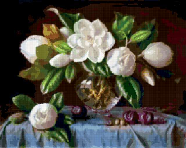 Ориентировочно так, схема вышивки «Variant 9», созданная автором Lamisa, будет выглядеть при отшиве на канве. Размер данной вышивки равен 190x151 крестов, при этом используется 73 цветов. Ключевые слова, по которым можно найти эту схему: цветы, cvety, букеты, натюрморт. Также, вы можете взглянуть на оригинальную картинку, соответствующую данной схеме вышивки.