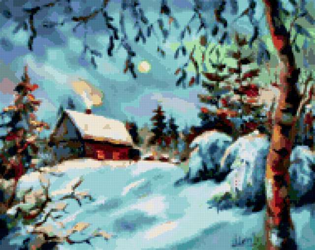 Ориентировочно так, схема вышивки «Variant 9», созданная автором Lamisa, будет выглядеть при отшиве на канве. Размер данной вышивки равен 190x151 крестов, при этом используется 63 цветов. Ключевые слова, по которым можно найти эту схему: домик, зима, вечер. Также, вы можете взглянуть на оригинальную картинку, соответствующую данной схеме вышивки.