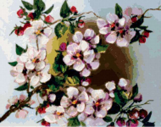 Ориентировочно так, схема вышивки «Vetka jabloni», созданная автором lukrecija12, будет выглядеть при отшиве на канве. Размер данной вышивки равен 190x150 крестов, при этом используется 57 цветов. Ключевые слова, по которым можно найти эту схему: cvety. Также, вы можете взглянуть на оригинальную картинку, соответствующую данной схеме вышивки.