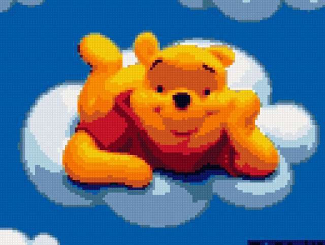 Ориентировочно так, схема вышивки «Vini-puh», созданная автором laletuanna, будет выглядеть при отшиве на канве. Размер данной вышивки равен 130x98 крестов, при этом используется 18 цветов. К несчастью, автор не назначил для схемы ключевые слова. Также, вы можете взглянуть на оригинальную картинку, соответствующую данной схеме вышивки.
