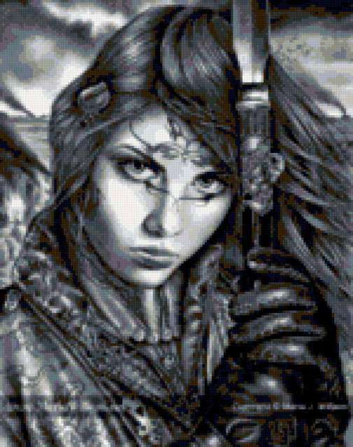 Ориентировочно так, схема вышивки «Voitelnica», созданная автором lukrecija12, будет выглядеть при отшиве на канве. Размер данной вышивки равен 150x190 крестов, при этом используется 16 цветов. Ключевые слова, по которым можно найти эту схему: zenshina, amazonka. Также, вы можете взглянуть на оригинальную картинку, соответствующую данной схеме вышивки.