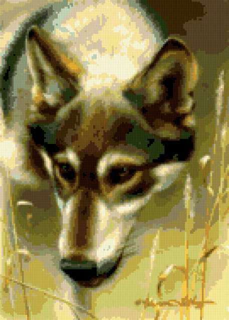 Ориентировочно так, схема вышивки «Volk», созданная автором lukrecija12, будет выглядеть при отшиве на канве. Размер данной вышивки равен 135x189 крестов, при этом используется 33 цветов. Ключевые слова, по которым можно найти эту схему: zivotnye. Также, вы можете взглянуть на оригинальную картинку, соответствующую данной схеме вышивки.