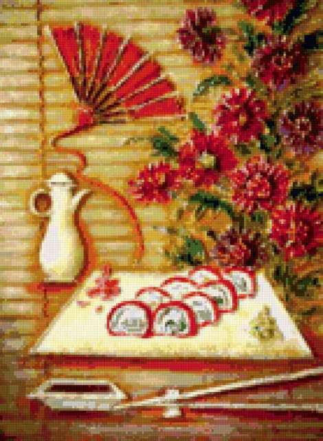 Ориентировочно так, схема вышивки «Vostochnyj natiurmort», созданная автором lukrecija12, будет выглядеть при отшиве на канве. Размер данной вышивки равен 139x189 крестов, при этом используется 62 цветов. Ключевые слова, по которым можно найти эту схему: natiurmort, vostok. Также, вы можете взглянуть на оригинальную картинку, соответствующую данной схеме вышивки.