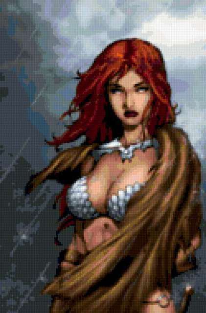 Ориентировочно так, схема вышивки «Warrior princess», созданная автором aniela, будет выглядеть при отшиве на канве. Размер данной вышивки равен 125x190 крестов, при этом используется 64 цветов. Ключевые слова, по которым можно найти эту схему: lady, woman, женщина, девушка, дамa. Также, вы можете взглянуть на оригинальную картинку, соответствующую данной схеме вышивки.