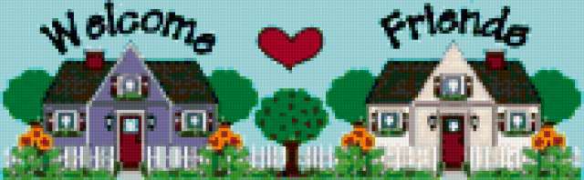 Ориентировочно так, схема вышивки «Welcome friends», созданная автором TARTARUGA, будет выглядеть при отшиве на канве. Размер данной вышивки равен 190x59 крестов, при этом используется 72 цветов. Ключевые слова, по которым можно найти эту схему: добро пожаловать, сердце, домики, деревья, цветы, забор, пейзаж, картинка, соседи. Также, вы можете взглянуть на оригинальную картинку, соответствующую данной схеме вышивки.