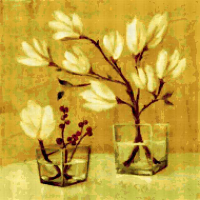 Ориентировочно так, схема вышивки «White Flowers», созданная автором pandreevska, будет выглядеть при отшиве на канве. Размер данной вышивки равен 190x190 крестов, при этом используется 41 цветов. Ключевые слова, по которым можно найти эту схему: цветок, букет, ваза, натюрморт. Также, вы можете взглянуть на оригинальную картинку, соответствующую данной схеме вышивки.