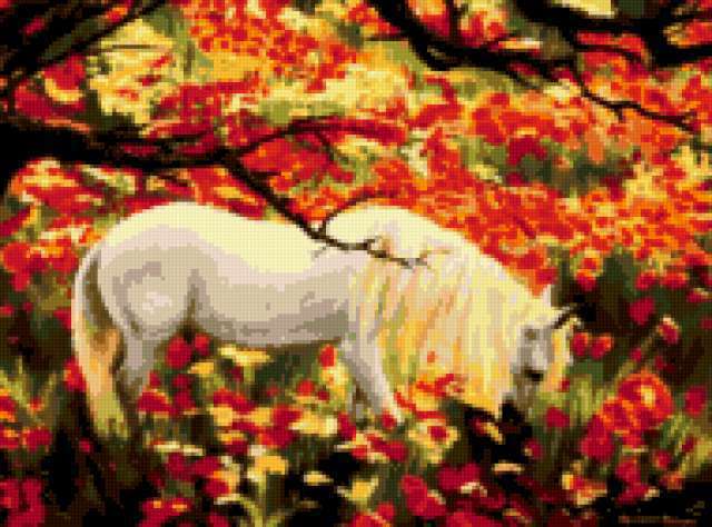 Ориентировочно так, схема вышивки «White Horse with Flowers», созданная автором pandreevska, будет выглядеть при отшиве на канве. Размер данной вышивки равен 190x141 крестов, при этом используется 56 цветов. Ключевые слова, по которым можно найти эту схему: flower, horse, white. Также, вы можете взглянуть на оригинальную картинку, соответствующую данной схеме вышивки.