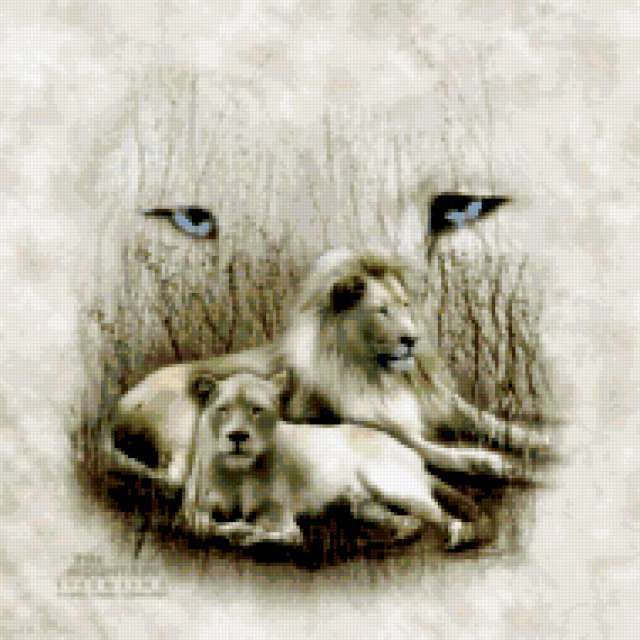 Ориентировочно так, схема вышивки «White Lion», созданная автором datoxi, будет выглядеть при отшиве на канве. Размер данной вышивки равен 190x190 крестов, при этом используется 57 цветов. Ключевые слова, по которым можно найти эту схему: львы, белый. Также, вы можете взглянуть на оригинальную картинку, соответствующую данной схеме вышивки.