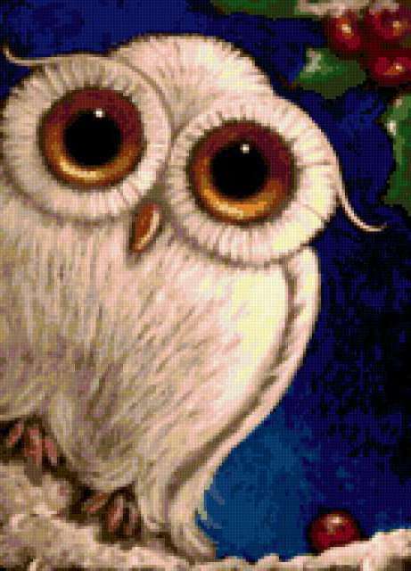 Ориентировочно так, схема вышивки «White Owl», созданная автором pandreevska, будет выглядеть при отшиве на канве. Размер данной вышивки равен 137x190 крестов, при этом используется 50 цветов. Ключевые слова, по которым можно найти эту схему: animals, животные, magic, owl . Также, вы можете взглянуть на оригинальную картинку, соответствующую данной схеме вышивки.