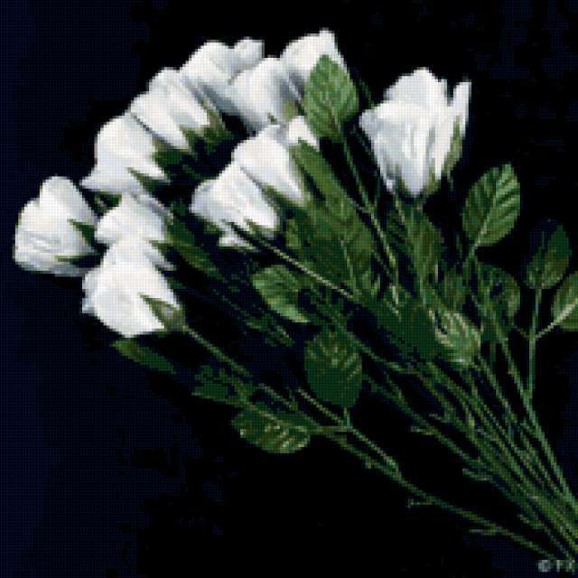 Ориентировочно так, схема вышивки «White Roses», созданная автором iborissova, будет выглядеть при отшиве на канве. Размер данной вышивки равен 190x190 крестов, при этом используется 55 цветов. Ключевые слова, по которым можно найти эту схему: рози, цветы. Также, вы можете взглянуть на оригинальную картинку, соответствующую данной схеме вышивки.