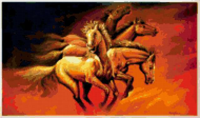 Ориентировочно так, схема вышивки «Wild Horses», созданная автором pandreevska, будет выглядеть при отшиве на канве. Размер данной вышивки равен 190x112 крестов, при этом используется 47 цветов. Ключевые слова, по которым можно найти эту схему: animals, животные, horse, wild. Также, вы можете взглянуть на оригинальную картинку, соответствующую данной схеме вышивки.