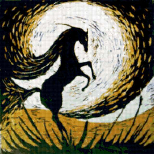 Ориентировочно так, схема вышивки «Wild Spirit», созданная автором pandreevska, будет выглядеть при отшиве на канве. Размер данной вышивки равен 190x190 крестов, при этом используется 53 цветов. Ключевые слова, по которым можно найти эту схему: конь, красота, сказка, фентези, spirit. Также, вы можете взглянуть на оригинальную картинку, соответствующую данной схеме вышивки.