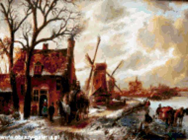 Ориентировочно так, схема вышивки «Windmill», созданная автором aniela, будет выглядеть при отшиве на канве. Размер данной вышивки равен 190x142 крестов, при этом используется 77 цветов. Ключевые слова, по которым можно найти эту схему: пейзаж, landscape. Также, вы можете взглянуть на оригинальную картинку, соответствующую данной схеме вышивки.