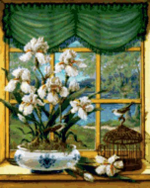 Ориентировочно так, схема вышивки «Window», созданная автором aniela, будет выглядеть при отшиве на канве. Размер данной вышивки равен 152x190 крестов, при этом используется 82 цветов. Ключевые слова, по которым можно найти эту схему: цветы, flowers, window. Также, вы можете взглянуть на оригинальную картинку, соответствующую данной схеме вышивки.