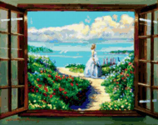 Ориентировочно так, схема вышивки «Window», созданная автором aniela, будет выглядеть при отшиве на канве. Размер данной вышивки равен 190x150 крестов, при этом используется 81 цветов. Ключевые слова, по которым можно найти эту схему: пейзаж, landscape. Также, вы можете взглянуть на оригинальную картинку, соответствующую данной схеме вышивки.
