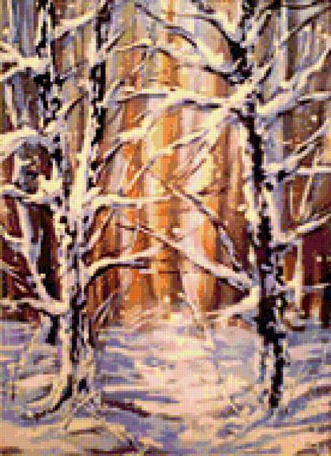 Ориентировочно так, схема вышивки «Winter landscape», созданная автором aniela, будет выглядеть при отшиве на канве. Размер данной вышивки равен 138x190 крестов, при этом используется 86 цветов. Ключевые слова, по которым можно найти эту схему: winter, пейзаж, landscape, зима. Также, вы можете взглянуть на оригинальную картинку, соответствующую данной схеме вышивки.
