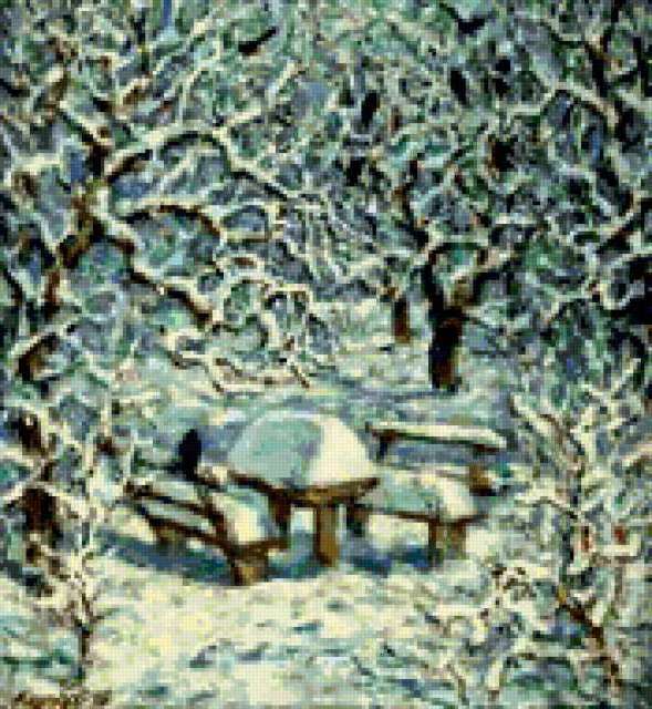 Ориентировочно так, схема вышивки «Winter landscape», созданная автором aniela, будет выглядеть при отшиве на канве. Размер данной вышивки равен 175x190 крестов, при этом используется 75 цветов. Ключевые слова, по которым можно найти эту схему: winter, пейзаж, landscape, зима. Также, вы можете взглянуть на оригинальную картинку, соответствующую данной схеме вышивки.